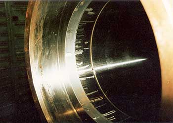 Repair of a SKF coupling. The damaged areas around the inner diameter reduce the support. The defects that have sometimes been only 1 mm deep were filled with copper, the whole diameter was coated with a 0,5 mm copper layer and then grinded to size |
